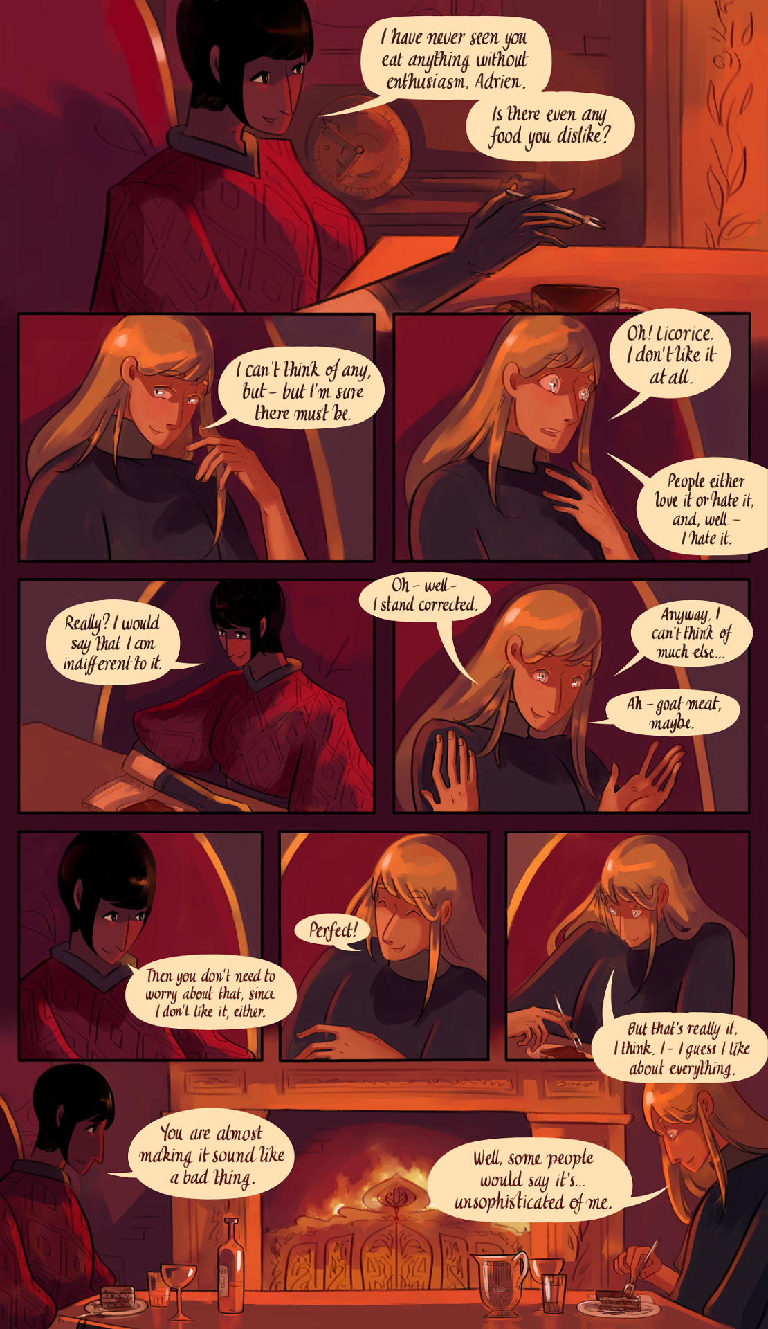 "I have never seen you eat anything without enthusiasm, Adrien", Valerion commented, smiling. "Is there even any food you dislike?", he added with a laugh.