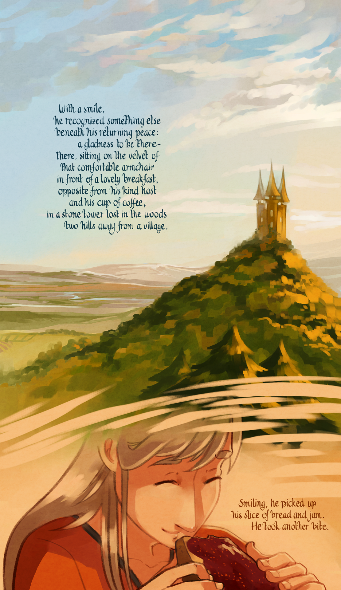 With a smile, he recognized something else beneath his returning peace: a gladness to be there - there, sitting on the velvet of that comfortable armchair in front of a lovely breakfast, opposite from his kind host and his cup of coffee, in a stone tower lost in the woods two hills away from a village.