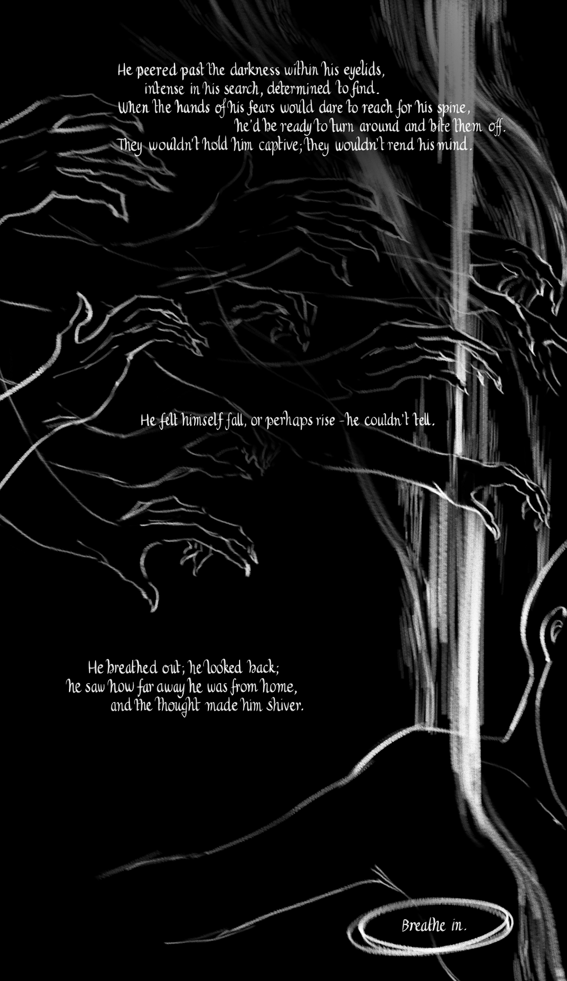 He peered past the darkness within his eyelids, intense in his search, determined to find. When the hands of his fears would dare to reach for his spine, he'd be ready to turn around and bite them off. They wouldn't hold him captive; they wouldn't rend his mind. He felt himself fall, or perhaps rise - he couldn't tell. He breathed out; he looked back; he saw how far away he was from home, and the thought made him shiver.