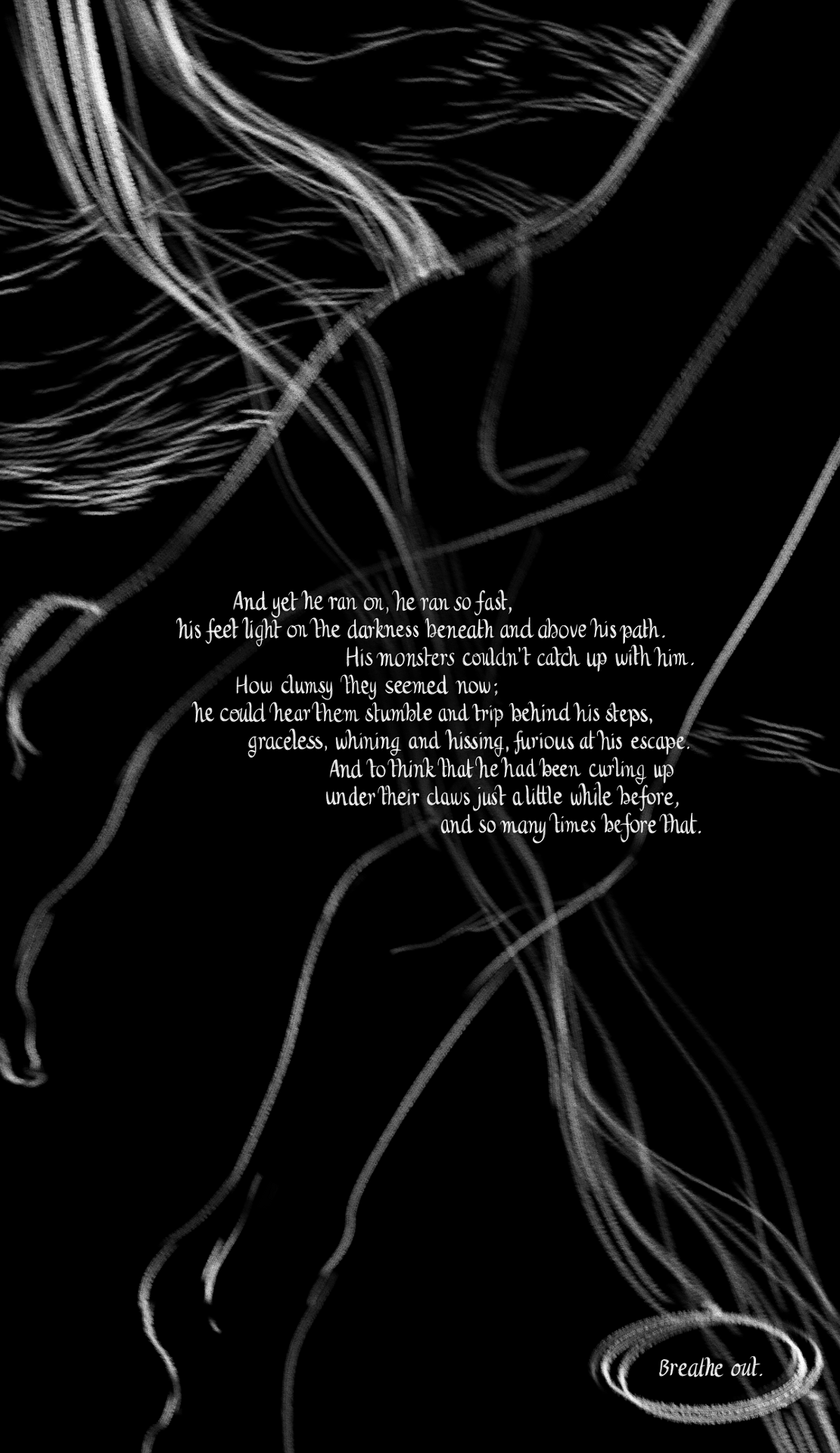 And yet he ran on, he ran so fast, his feet light on the darkness beneath and above his path. His monsters couldn't catch up with him. How clumsy they seemed now; he could hear them stumble and trip behind his steps, graceless, whining and hissing, furious at his escape. And to think that he had been curling up under their claws just a little while before, and so many times before that.