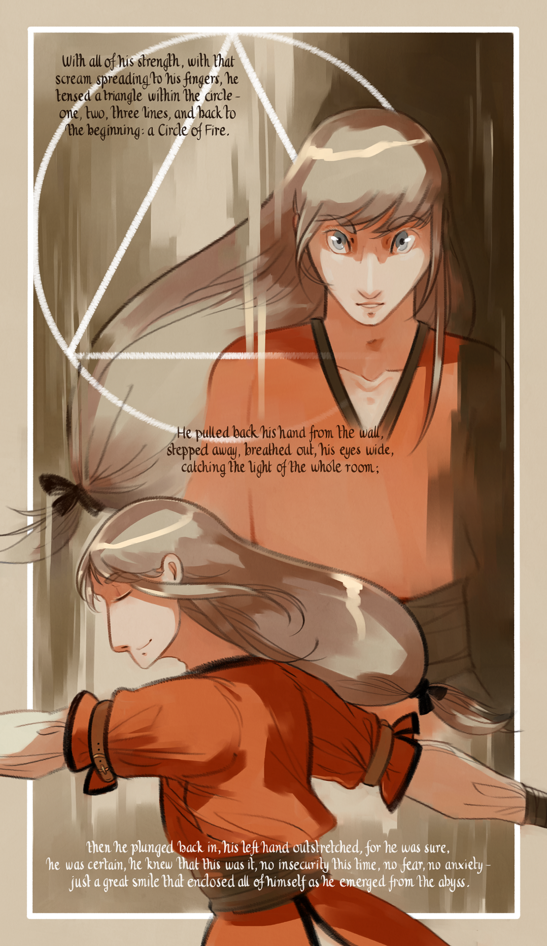 With all of his strength, with that scream spreading to his fingers, he tensed a triangle within the circle - one, two, three lines, and back to the beginning: a Circle of Fire. He pulled back his hand from the wall, stepped away, breathed out, his eyes wide, catching the light of the whole room; then he plunged back in, his left hand outstretched, for he was sure, he was certain, he knew that this was it, no insecurity this time, no fear, no anxiety - just a great smile that enclosed all of himself as he emerged from the abyss.
