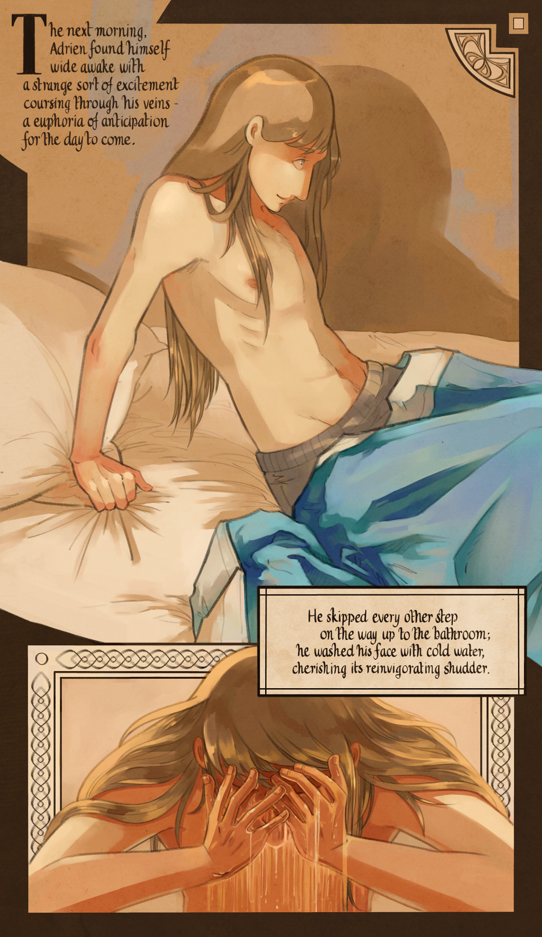 The next morning, Adrien found himself wide awake with a strange sort of excitement coursing through his veins - a euphoria of anticipation for the day to come. He skipped every other step on the way up to the bathroom; he washed his face with cold water, cherishing its reinvigorating shudder.