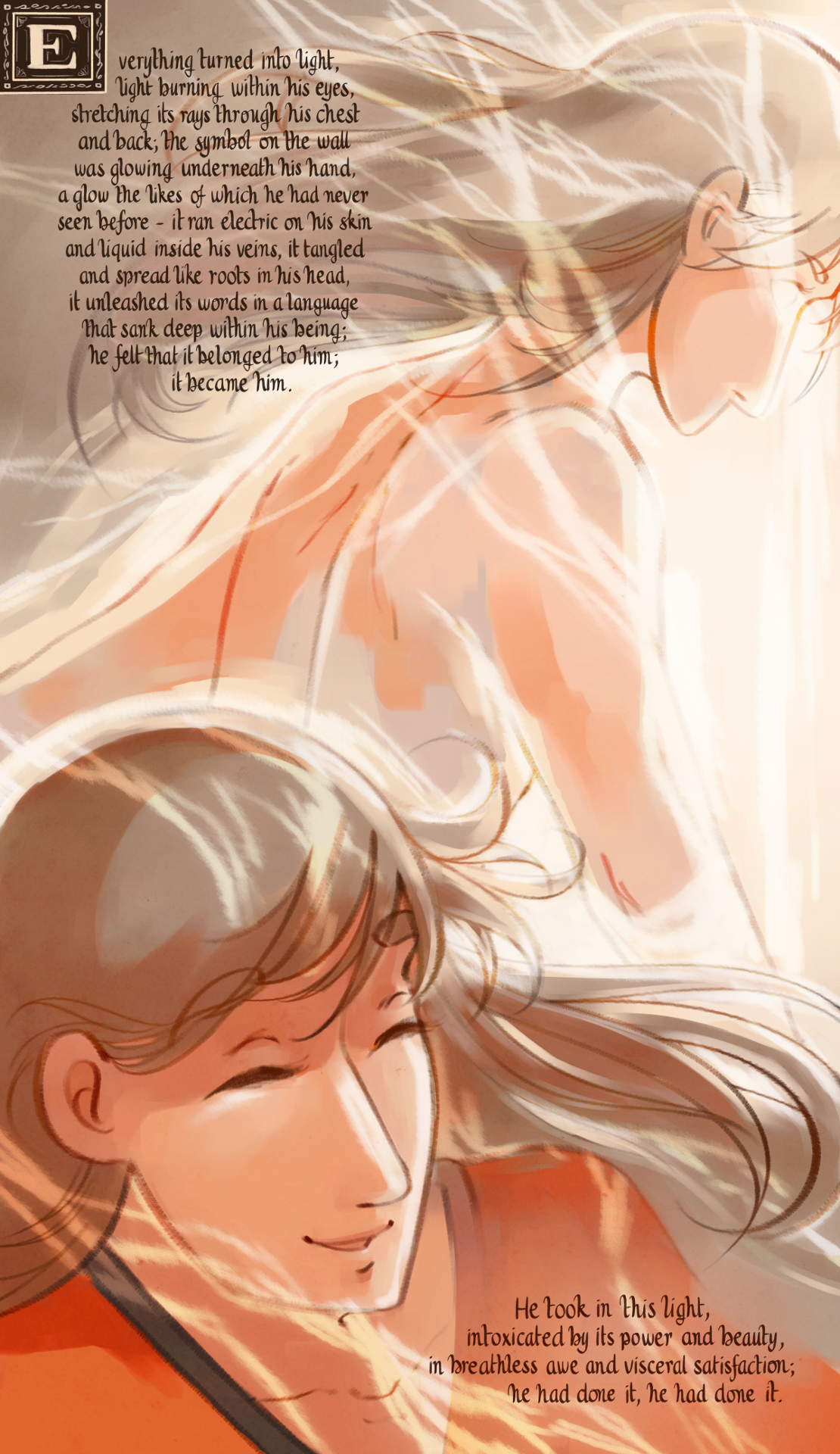 Everything turned into light, light burning within his eyes, stretching its rays through his chest and back; the symbol on the wall was glowing underneath his hand, a glow the likes of which he had never seen before - it ran electric on his skin and liquid inside his veins, it tangled and spread like roots in his head, it unleashed its words in a language that sank deep within his being; he felt that it belonged to him; it became him. He took in this light, intoxicated by its power and beauty, in breathless awe and visceral satisfaction; he had done it, he had done it.