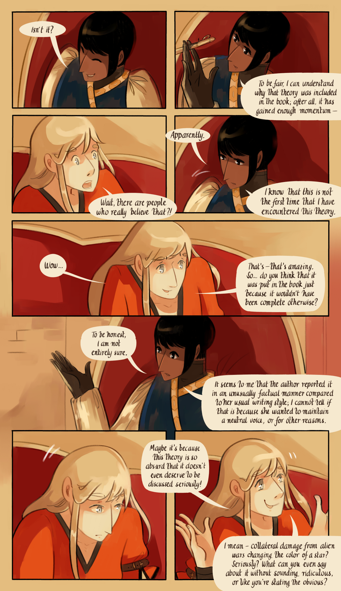 "Isn't it?", Valerion laughed. He twirled his fountain pen in his hands, then set it down on the table. "To be fair, I can understand why that theory was included in the book; after all, it has gained enough momentum --".