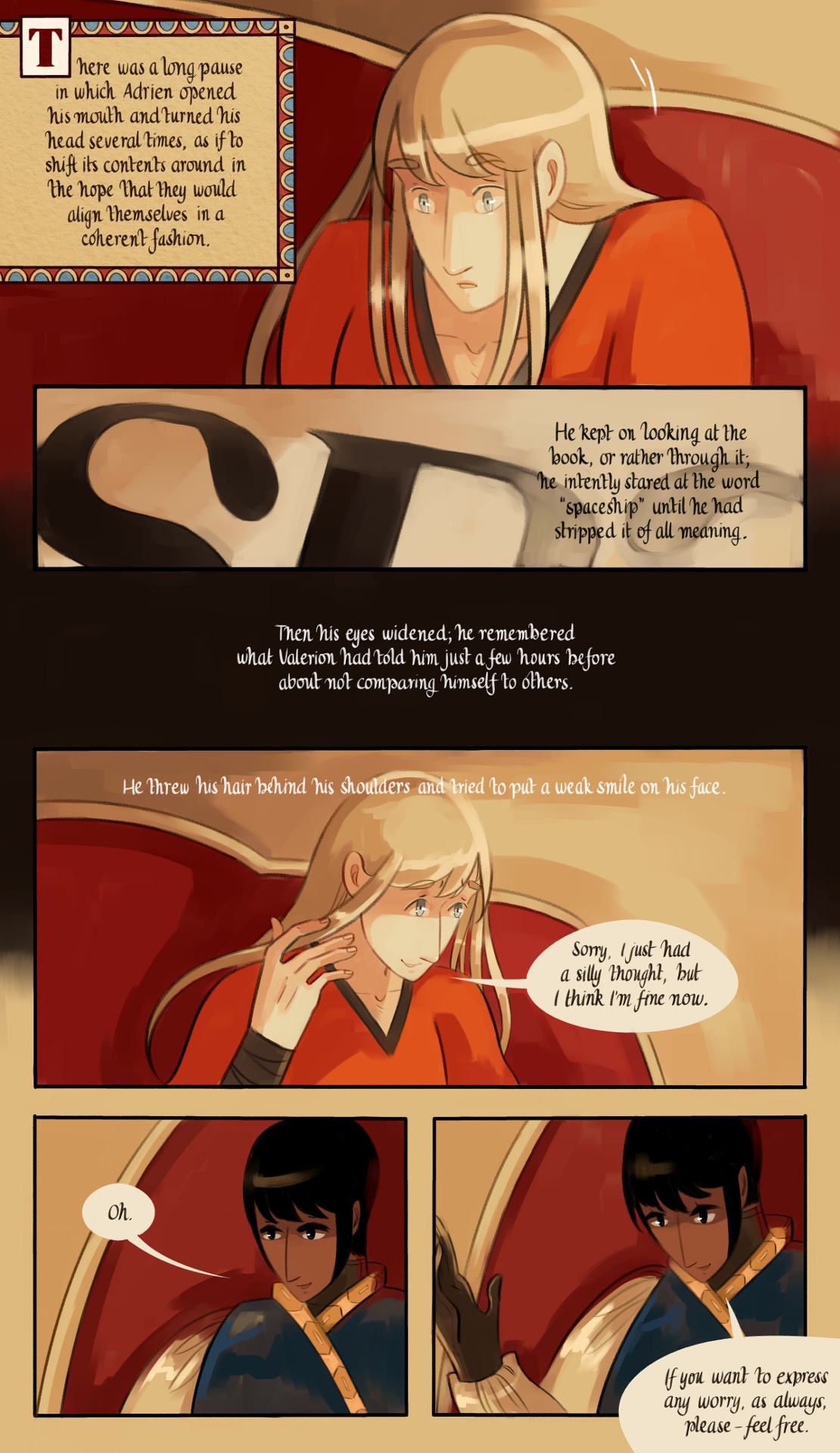 There was a long pause in which Adrien opened his mouth and turned his head several times, as if to shift its contents around in the hope that they would align themselves in a coherent fashion. He kept on looking at the book, or rather through it; he intently stared at the word "spaceship" until he had stripped it of all meaning. Then his eyes widened; he remembered what Valerion had told him just a few hours before about not comparing himself to others. He threw his hair behind his shoulders and tried to put a weak smile on his face.