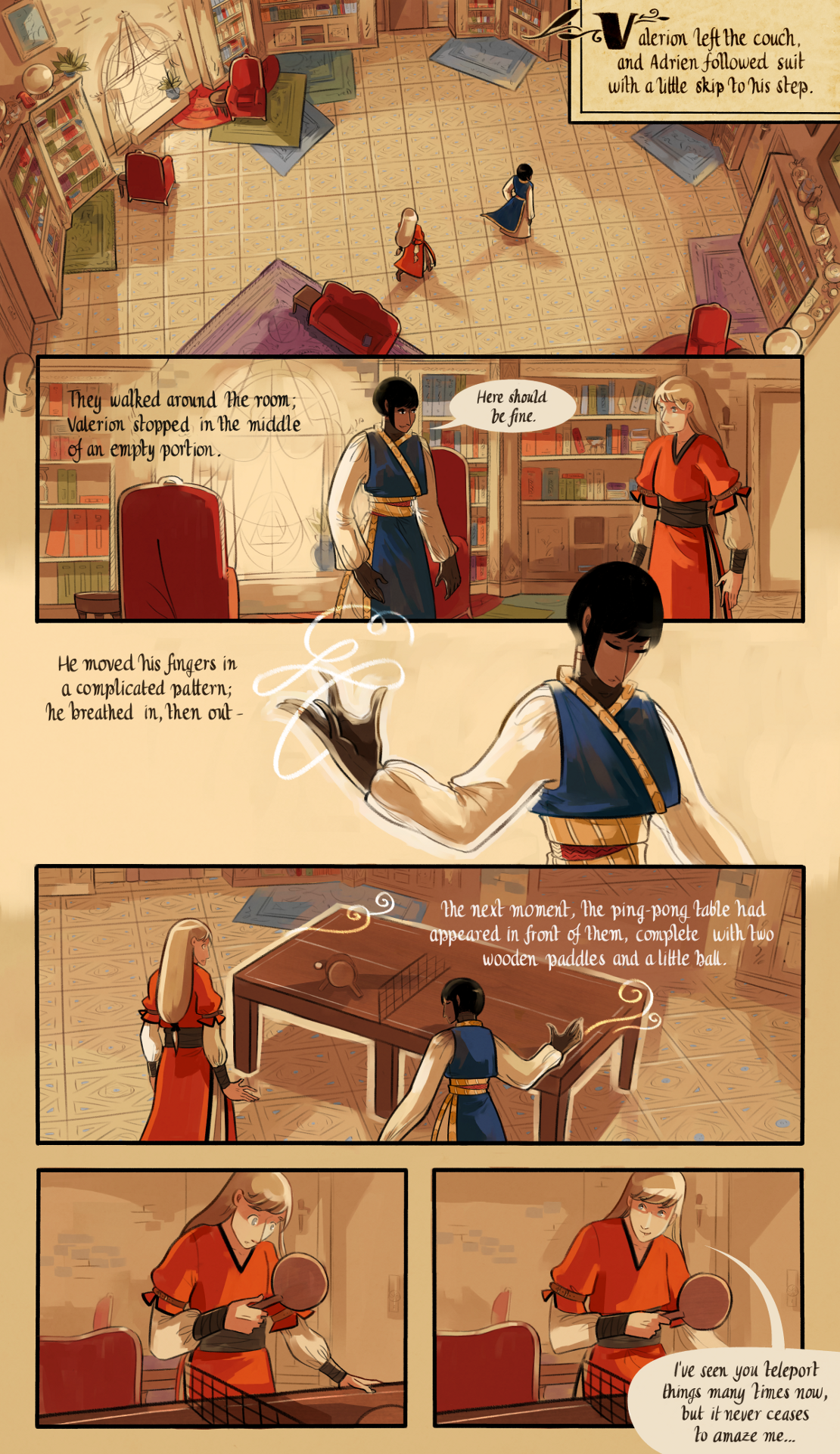 Valerion left the couch, and Adrien followed suit with a little skip to his step. They walked around the room; Valerion stopped in the middle of an empty portion - "Here should be fine", he declared. He moved his fingers in a complicated pattern; he breathed in, then out - the next moment, the ping-pong table had appeared in front of them, complete with two wooden paddles and a little ball. Adrien walked towards the table, his eyes wide; he picked up a paddle and turned it around in his hands, then set it down again. "I've seen you teleport things many times now, but it never ceases to amaze me", he said, a little laugh to his tone; Valerion smiled in response.