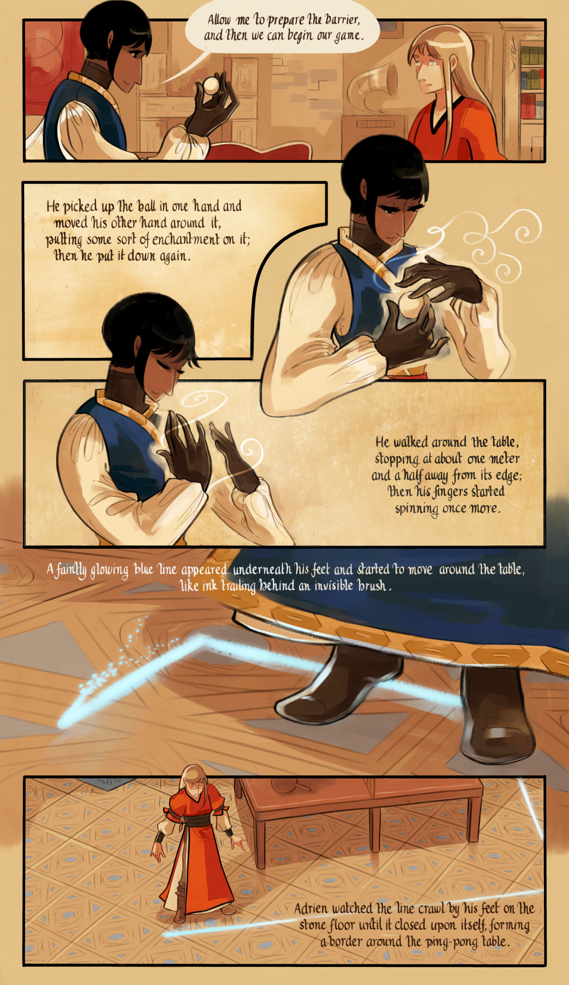 "Allow me to prepare the barrier, and then we can begin our game", he said. He picked up the ball in one hand and moved his other hand around it, putting some sort of enchantment on it; then he put it down again. He walked around the table, stopping at about one meter and a half away from its edge; then his fingers started spinning once more. A faintly glowing blue line appeared underneath his feet and started to move around the table, like ink trailing behind an invisible brush. Adrien watched the line crawl by his feet on the stone floor until it closed upon itself, forming a border around the ping-pong table.