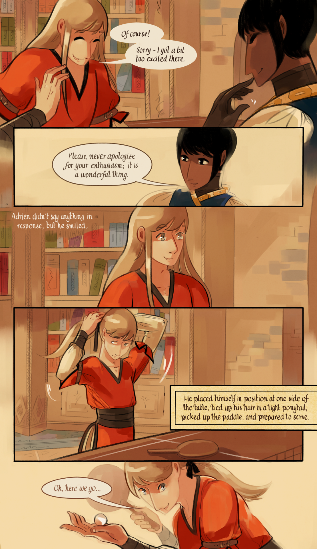 Adrien didn't say anything in response, but he smiled. He placed himself in position at one side of the table, tied up his hair in a tight ponytail, picked up the paddle, then prepared to serve.