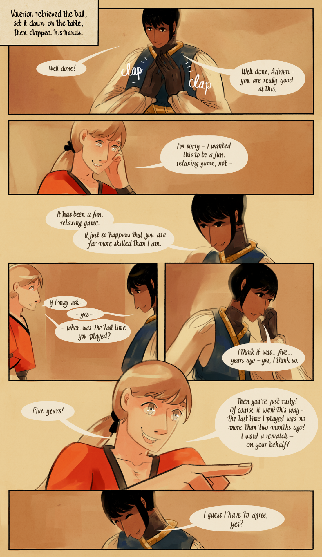 "Five years!", Adrien commented, chuckling. "Then you're just rusty! Of course it went this way -- the last time I played was no more than two months ago! I want a rematch -- on your behalf!".