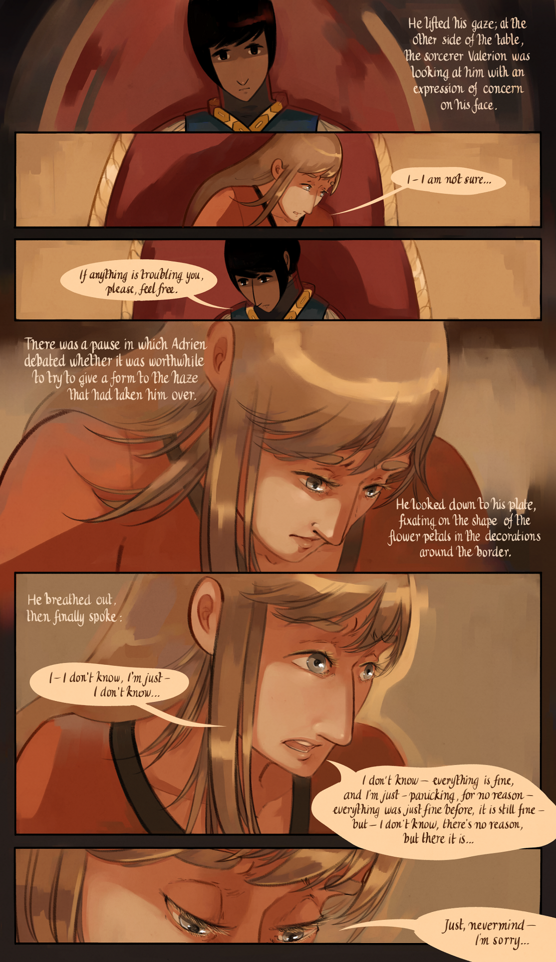 He lifted his gaze; at the other side of the table, the sorcerer Valerion was looking at him with an expression of concern on his face. "I -- I am not sure", Adrien mumbled.