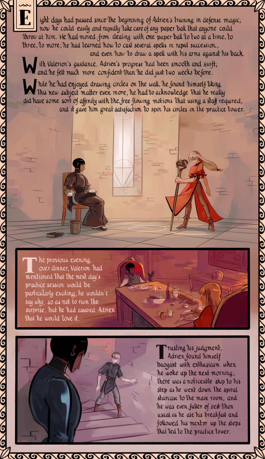 The previous evening, over dinner, Valerion had mentioned that the next day's practice session would be particularly exciting; he wouldn't say why, so as not to ruin the surprise, but he had assured Adrien that he would love it. Trusting his judgment, Adrien found himself buoyant with enthusiasm when he woke up the next morning; there was a noticeable skip to his step as he went down the spiral staircase to the main room, and he was even fuller of zest than usual as he ate his breakfast and followed his mentor up the steps that led to the practice tower.