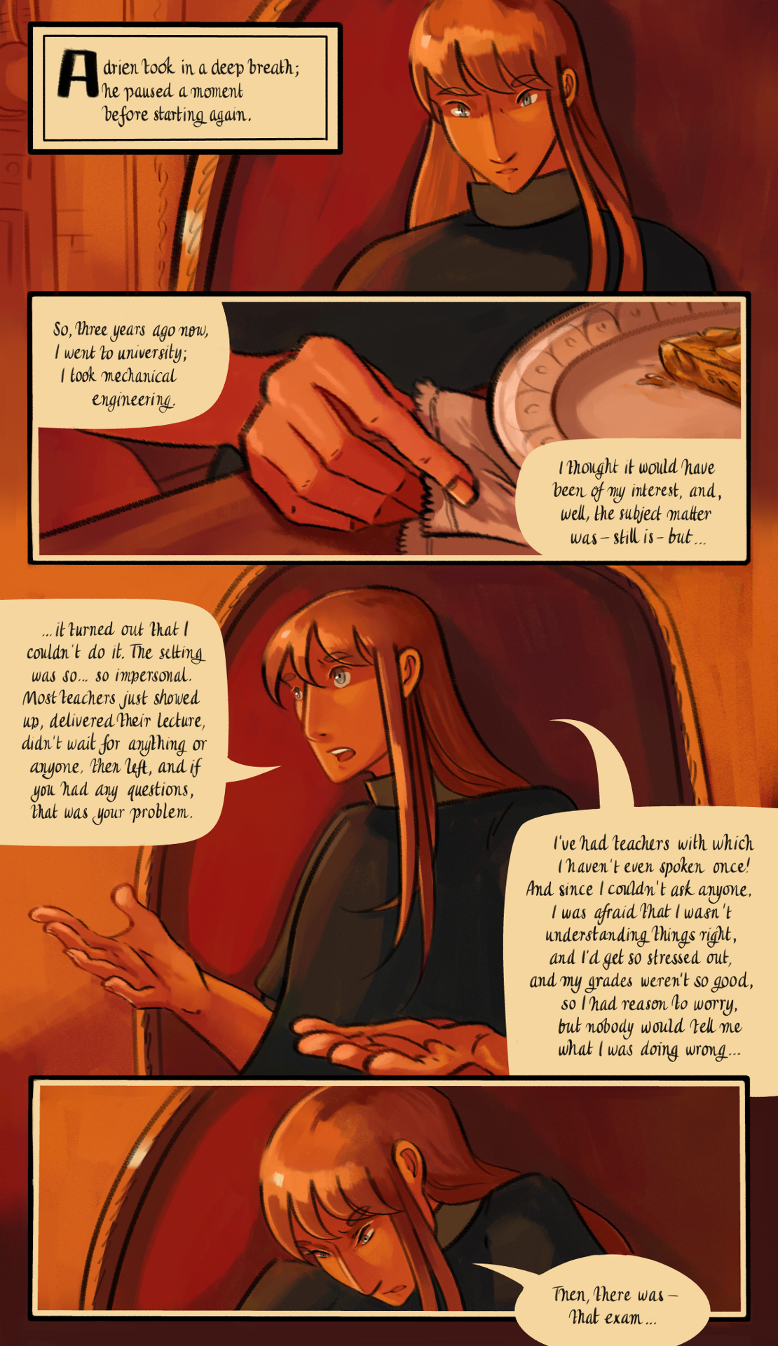 Adrien took in a deep breath; he paused a moment before starting again. His fingers went to play with the embroidered hem of the napkin. "So, three years ago now, I went to university; I took mechanical engineering. I thought it would have been of my interest, and, well, the subject matter was -- still is -- but... it turned out that I couldn't do it. The setting was so... so impersonal. Most teachers just showed up, delivered their lecture, didn't wait for anything or anyone, then left, and if you had any questions, that was your problem. I've had teachers with which I haven't even spoken once! And since I couldn't ask anyone, I was afraid that I wasn't understanding things right, and I'd get so stressed out, and my grades weren't so good, so I had reason to worry, but nobody would tell me what I was doing wrong!... Then, there was -- that exam...".