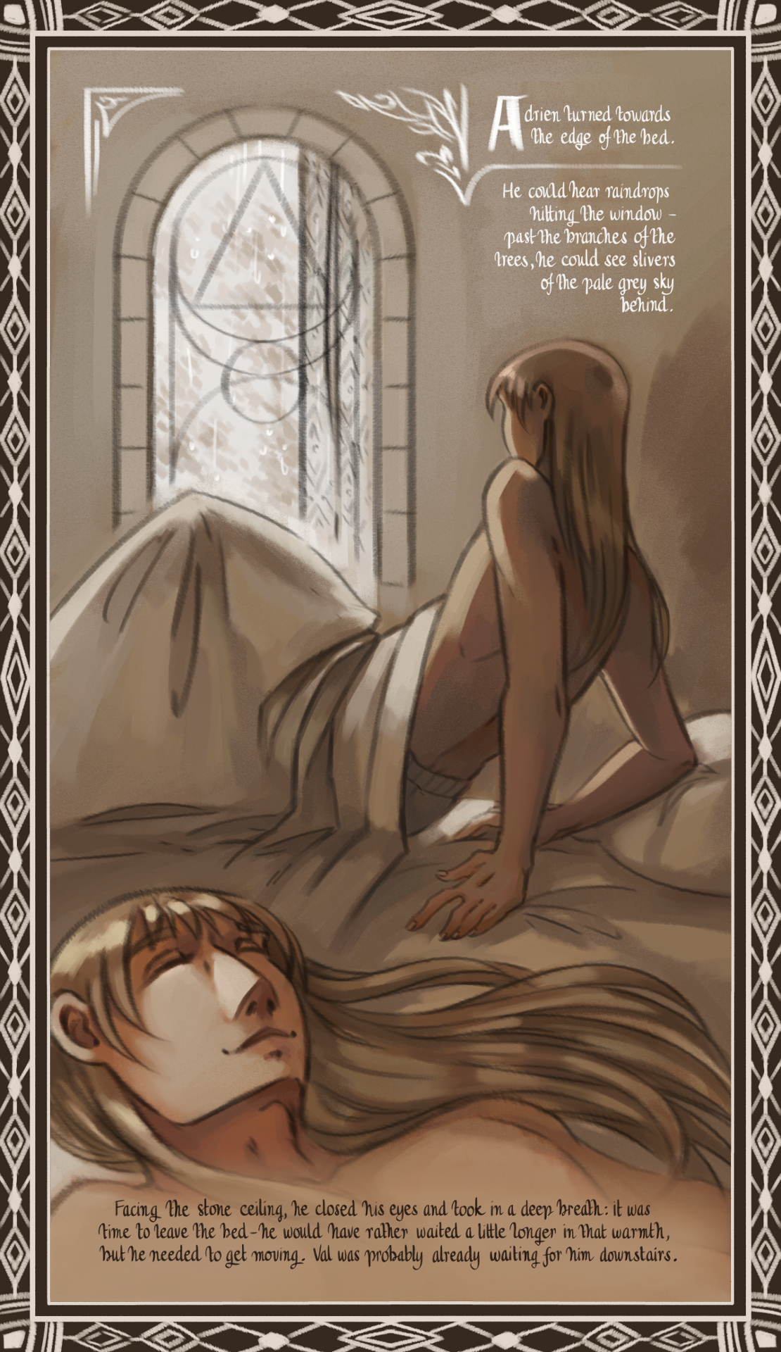 Adrien turned towards the edge of the bed. He could hear raindrops hitting the window - past the branches of the trees, he could see slivers of the pale grey sky behind. He turned with his back on the sheets. Facing the stone ceiling, he closed his eyes and took in a deep breath: it was time to leave the bed - he would have rather waited a little longer in that warmth, but he needed to get moving. Val was probably already waiting for him downstairs.